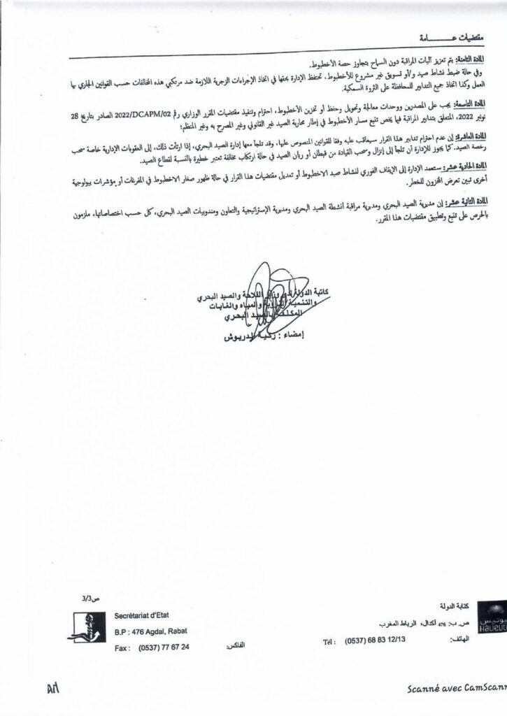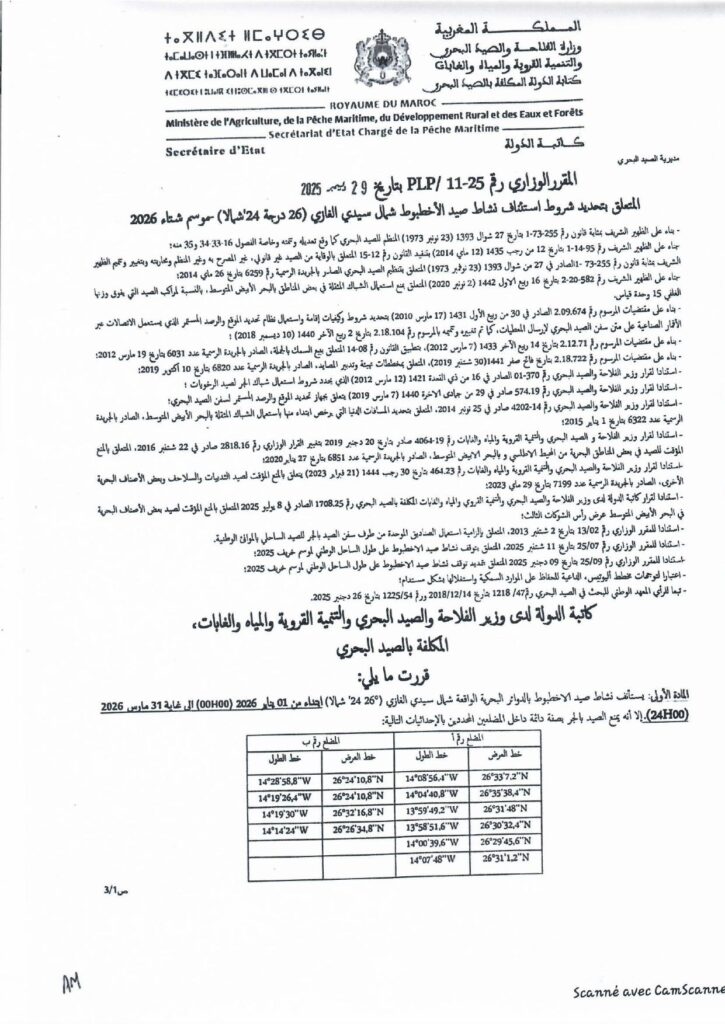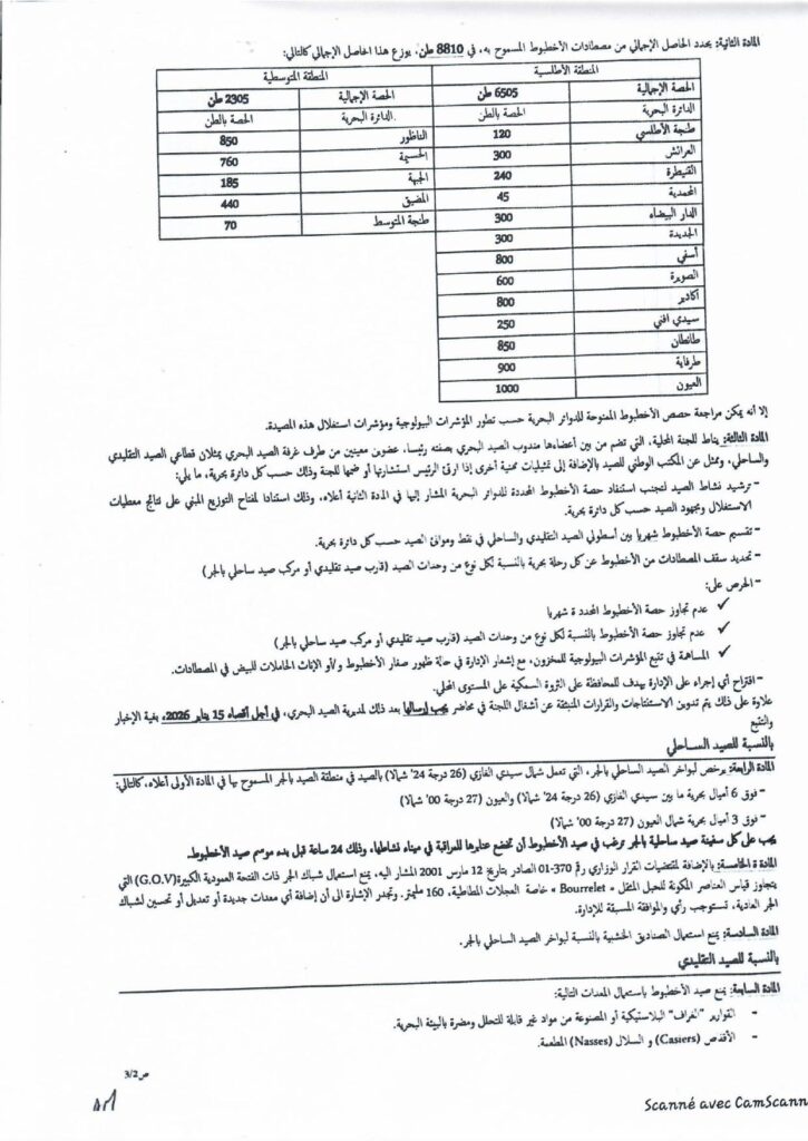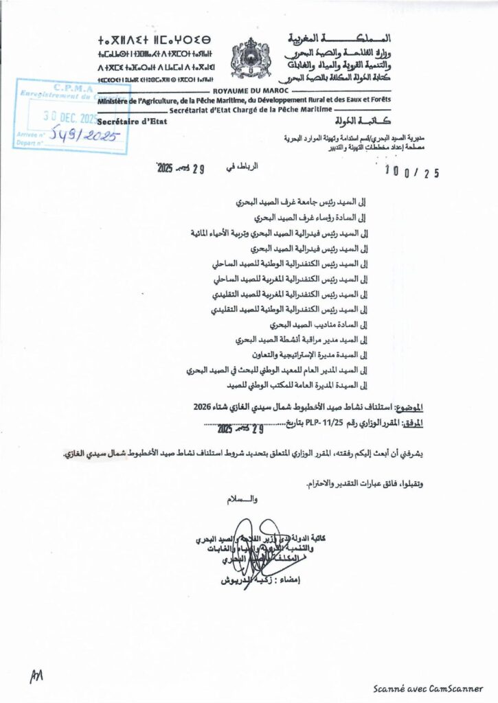إعلان حول المقرر الوزاري المتعلق باستئناف نشاط صيد الأخطبوط شمال سيدي الغازي،موسم شتاء 2026.