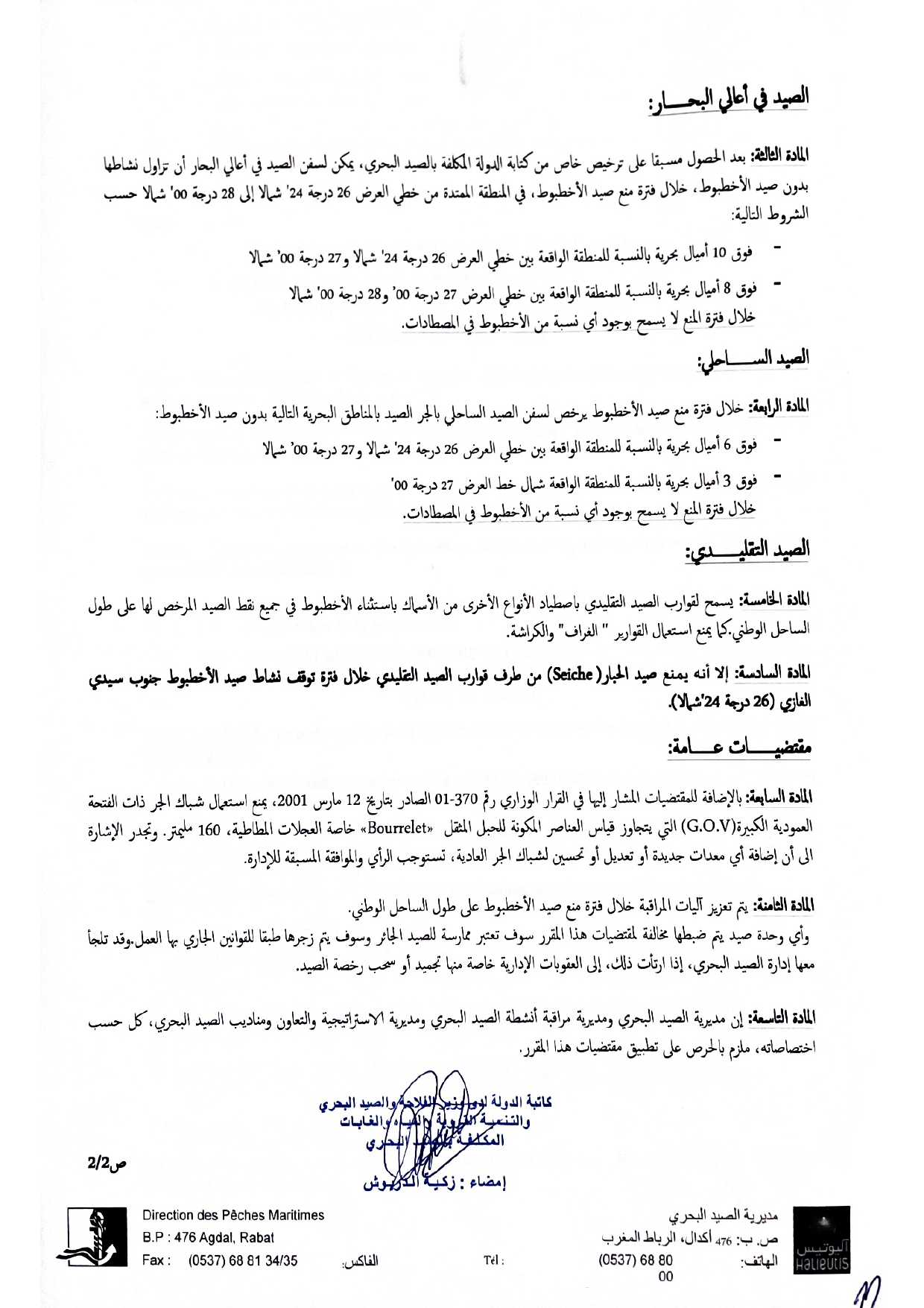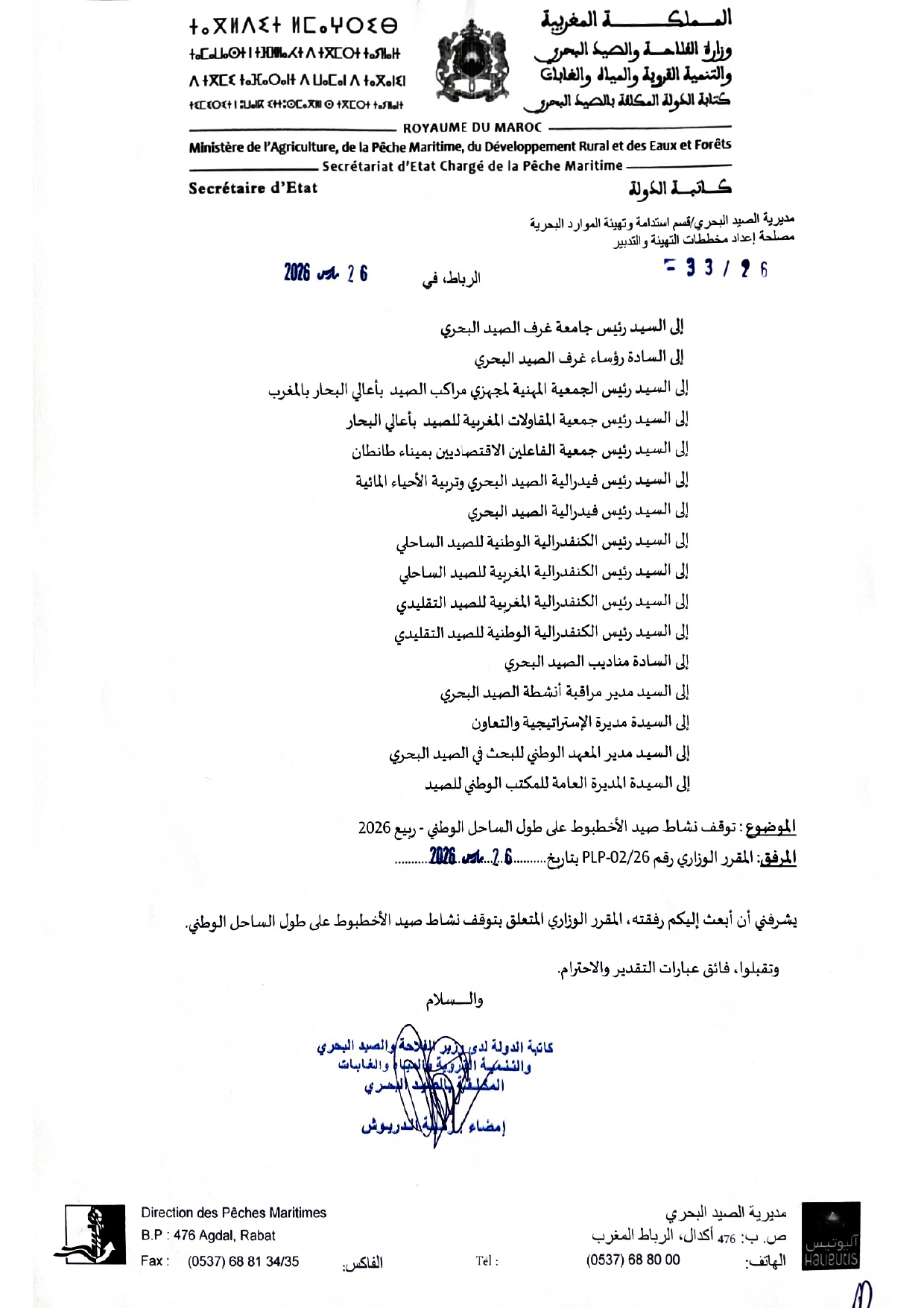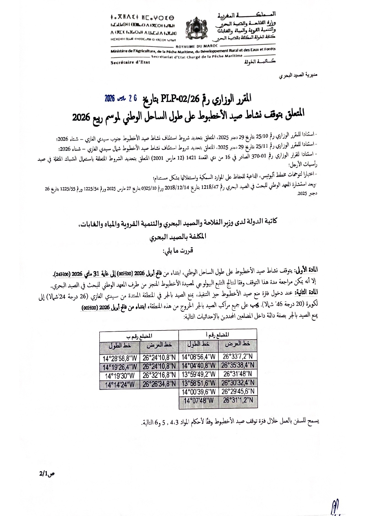 إعلان عن المقرر الوزاري المتعلق بتوقف نشاط صيد الأخطبوط على طول الساحل الوطني-ربيع 2026