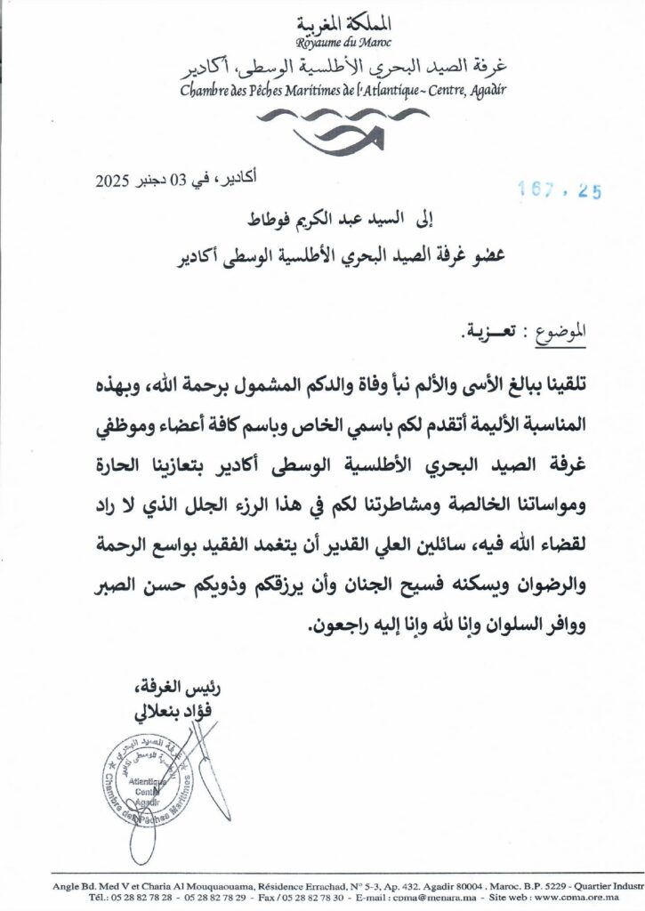 تلقينا ببالغ الأسى والألم نبأ وفاة والدكم المشمول برحمة الله،وبهذه المناسبة الأليمة أتقدم لكم باسمي وباسم كافة أعضاء وموظفي غرفة الصيد البحري الأطلسية الوسطى أكادير،بتعازينا الحارة ومواساتنا الخالصة ومشاطرتنا لكم في هذا الرزء الجلل الذي لا رد لقضاء الله فيه،سائلين العلي القدير أن يتغمد الفقيد بواسع الرحمة والرضوان ويسكنه فسيح الجنان وأن يرزقكم وذويكم حسن الصبر ووافر السلوان وإن لله وإنا إليه راجعون.