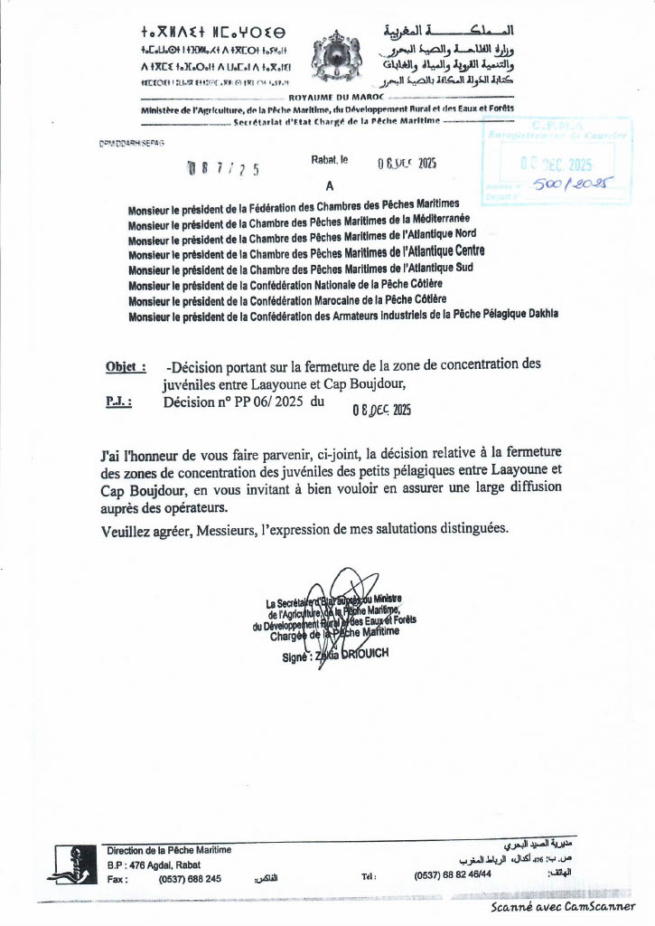 قرار بشأن إغلاق منطقة تركيز صغار الأسماك السطحية الصغيرة بين العيون وبوجدور.