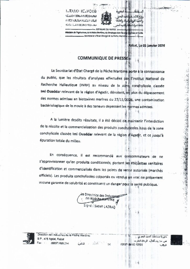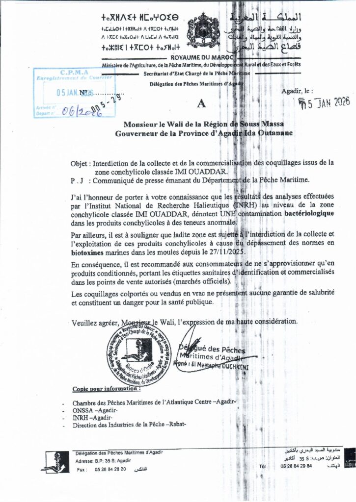 قرار حول حظر جمع و تسويق الصدفيات من منطقة” إمي وادار” التابعة للمجال الترابي والبحري لغرفة الصيد البحري الأطلسية الوسطى أكادير.