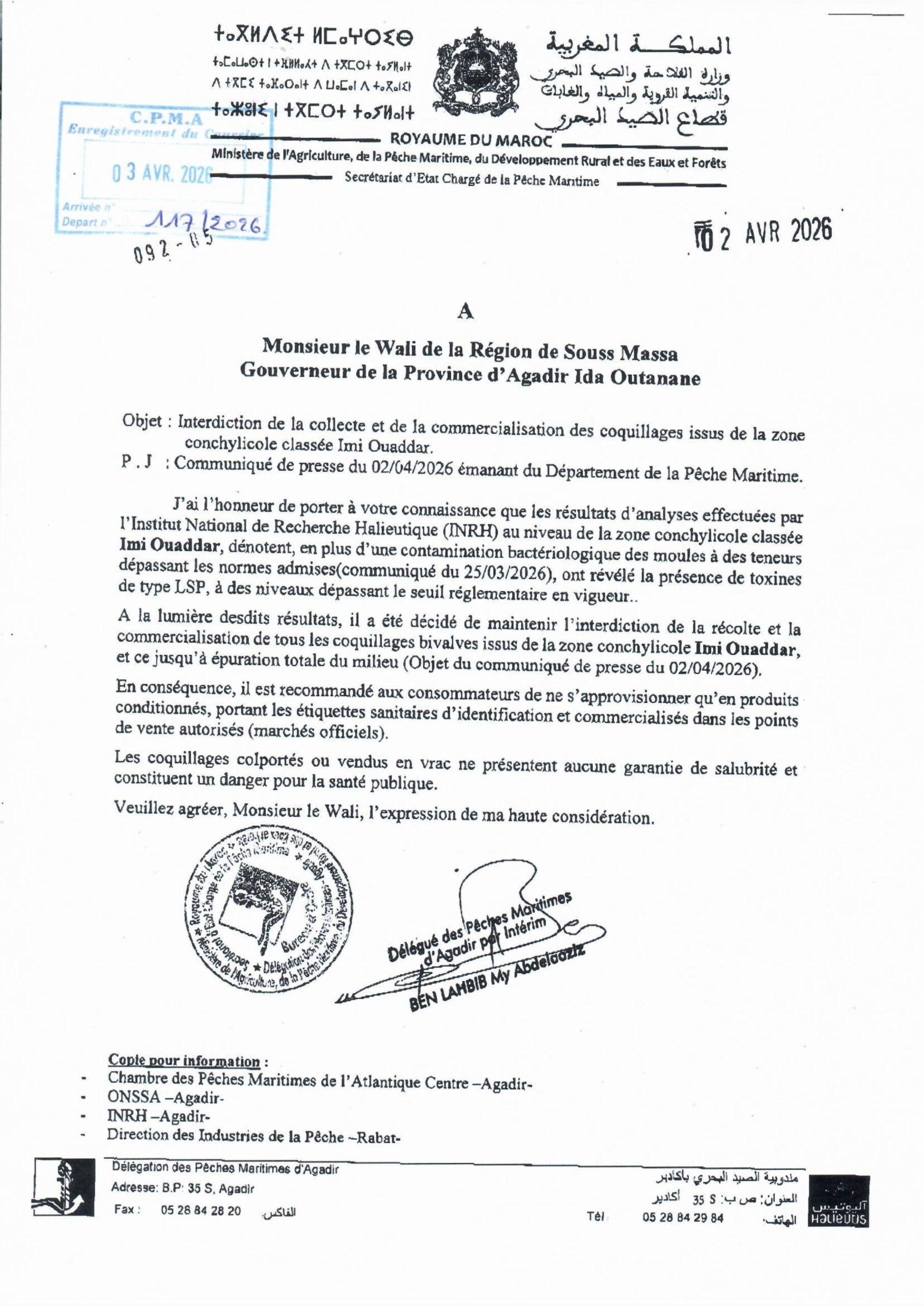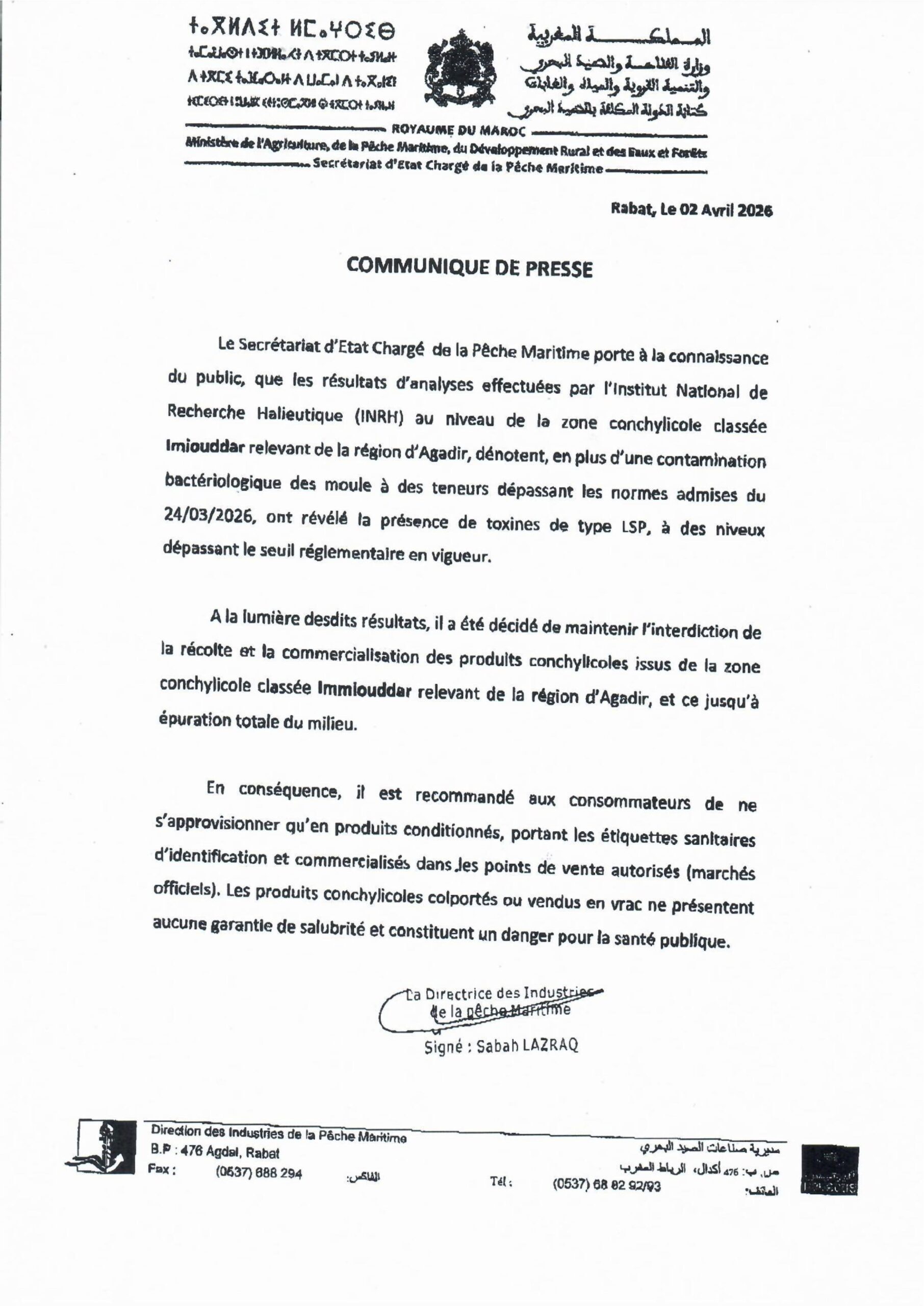قرار منع جمع وتسويق جميع أنواع المحار ثنائي الصدفة من منطقة إمي ودار.